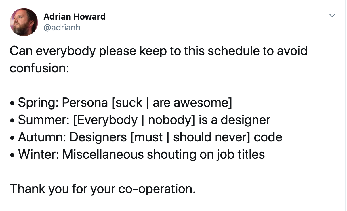 Ok, that might be a. bit much to ask for. But if more designers consider pushing back on over-specialized job titles, or even engaging in discussions about them, we can make more progress in the places where our effort can have the biggest impact. That is: let's use words that the rest of. the world can understand, and then engage them in conversation. What do you think? Let me know!