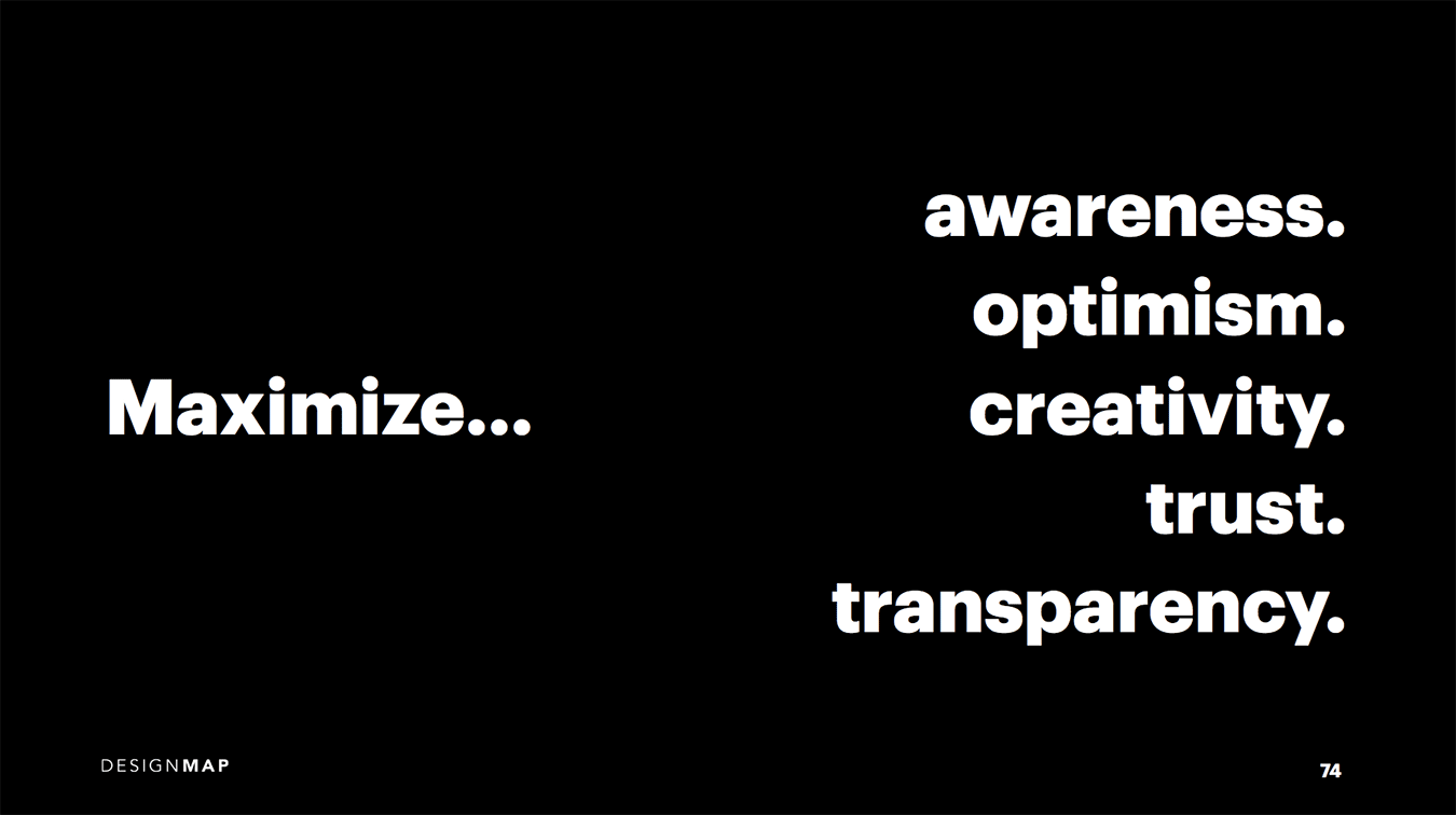 Optimism: Maximize passion and vision that inspires action by maximizing design’s ability to connect making with meaning. Through optimism, we talk of communicating a vision of the business helps drive the team forward together.