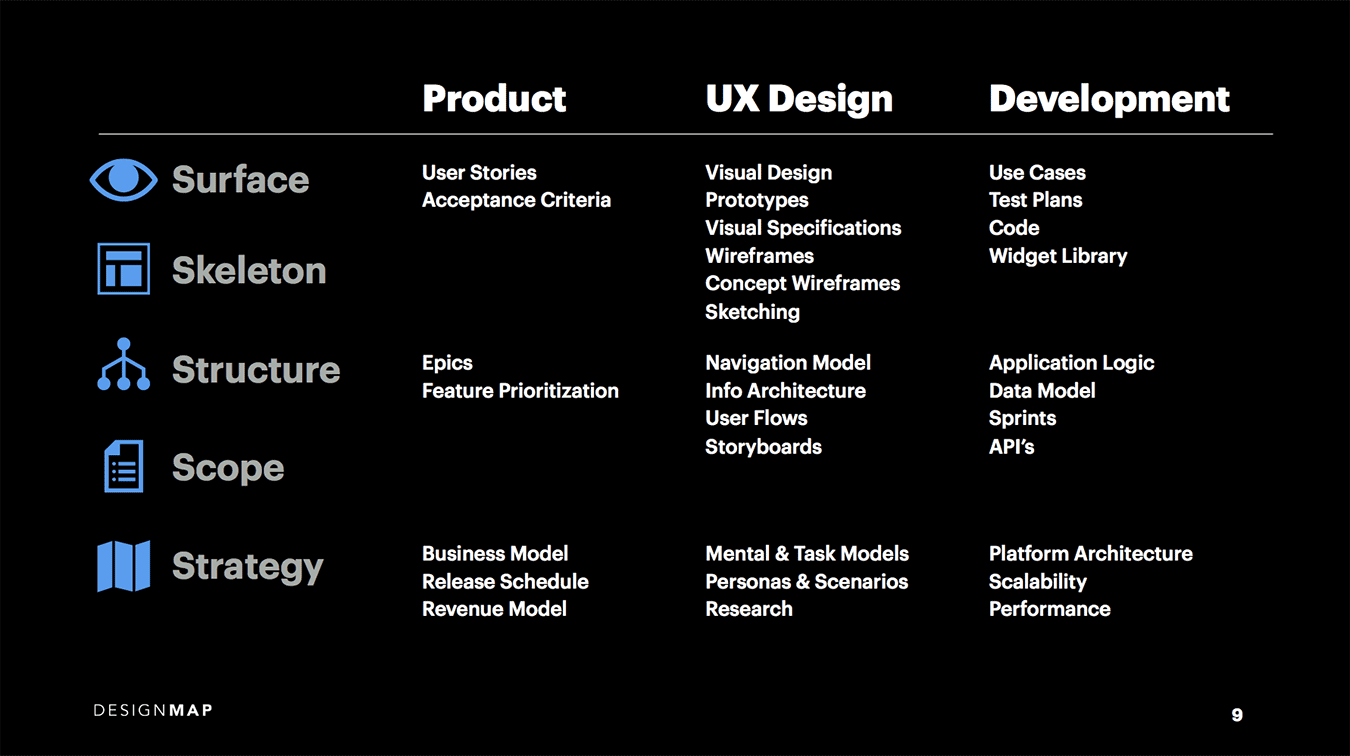 For business leaders, we have compiled a deck of user experience design tools that we leveraged and enhanced over the course of our 11 years (well longer because we started using these before banding together as DesignMap). The deck is organized around Jesse James Garrett’s model from “The Elements of User Experience Design”, but redrawn for our purposes.