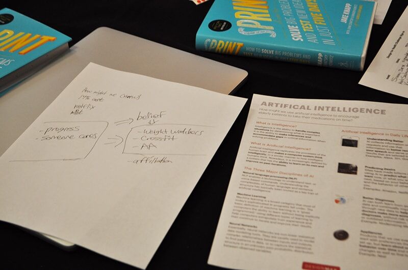 The point of a workshop is to create a great outcome. Even in a small conference workshop, we prioritized bringing people’s ideas to life. At the end of the two-hour session, each workshop participant got to share their idea in front of the group in an art museum style share-out. We had one ‘Decider’ pick a winning concept. After that, four DesignMap designers created a real prototype from the winning concept and that prototype was revealed at our booth at the end of the day. These two important milestones helped bring everybody together and create a shared sense of accomplishment for the day.