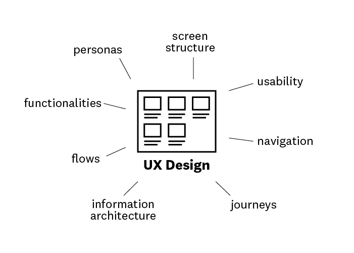 Typical UX design tools include user personas, user journeys, user flows. UX design deals with functionalities, usability, navigation, information architecture and screen structure.